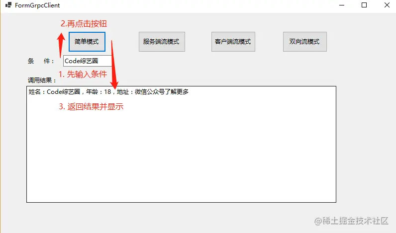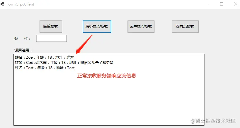 先运行服务端,在运行客户端,点击服务端流模式按钮,效果如下: