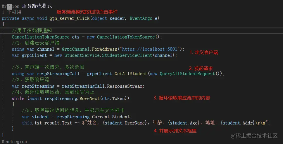 在winform设计模式下,双击服务端流模式按钮增加点击事件,开始写业务逻辑