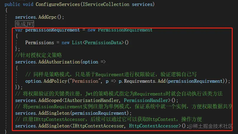 gRPC的权限管控和WebApi的管控方式一样,同样可以使用策略的方式进行权限验证。gRPC同样能获取到请求方法的Url(包名.服务名.方法名),这样就可以以这种规则进行权限配置,然后验证即可。详细步骤可以参考跟我一起学.NetCore之熟悉的接口权限验证不能少(Jwt),接下来就来说说主要步骤: