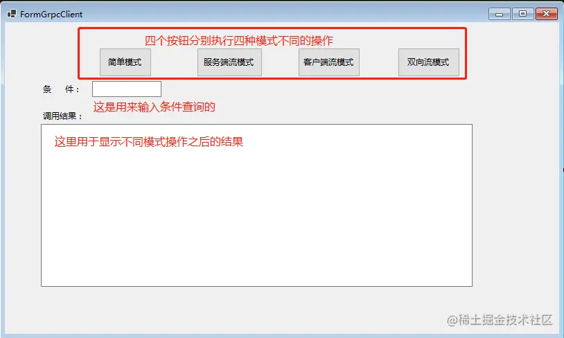 在winform设计模式下,双击客户端流模式按钮增加点击事件,开始写业务逻辑。代码稍多,不截图了,不然图片大要失真,直接上代码吧。