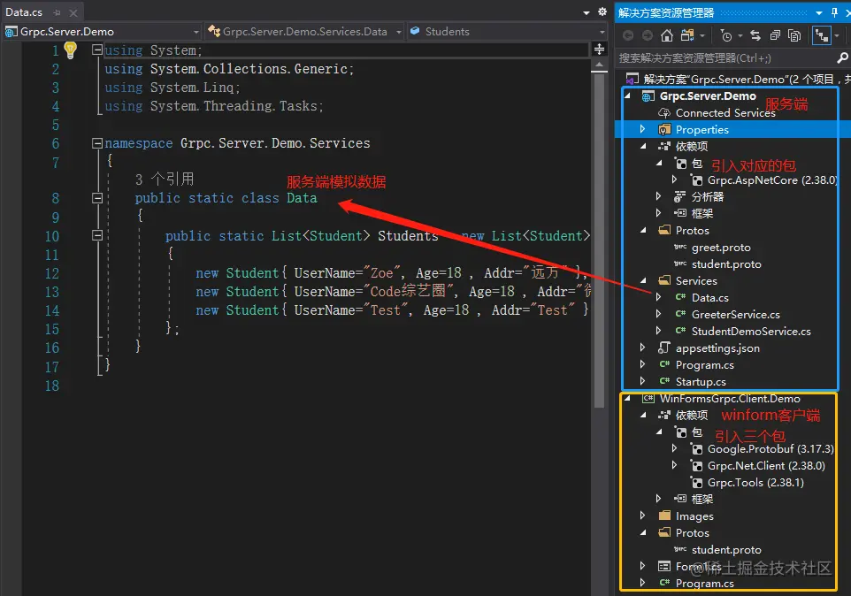 以下案例演示,服务端用微软提供的模板创建,客户端使用Winform程序演示,基于.NetCore3.1版本。具体创建步骤在上一篇说的很细了(gRPC趁现在还没大火,抢先了解一下),接下来就直接搞重点;这里就模仿一个学生服务,包含增、删、改、查方法,下面是用到的proto文件的全部内容,后续的实例就单独标出重点即可。