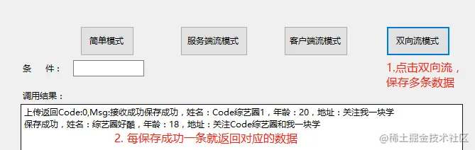 先运行服务端,在运行客户端,点击双向流模式按钮,效果如下: