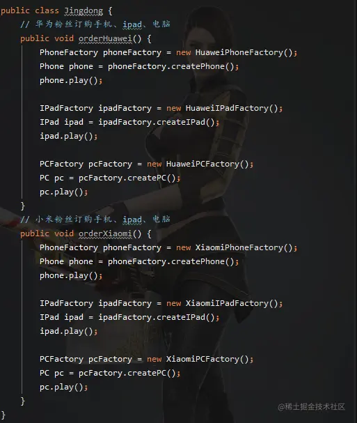 在订购类中,不同的订购方法调用不同的工厂获取对象。比如京东订购类的代码如下(淘宝订购类处理逻辑类似,这里不再贴淘宝类的代码)
