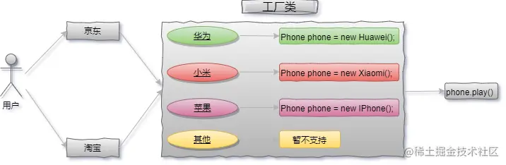 套用到这个例子中就是:创建一个工厂类,由工厂类来封装创建手机的逻辑。订购类从工厂类中获取手机对象直接使用,不再关心手机创建的过程