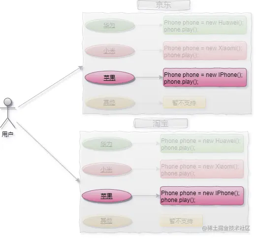 当用户进入华为专卖店,就默认用户要订购华为手机;当用户进入小米专卖店,就默认用户要订购小米手机;当用户进入苹果专卖店,就默认用户要订购苹果手机
