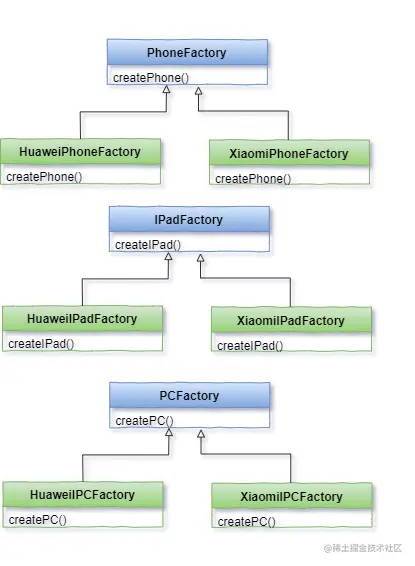 可以用刚才讲的工厂方法模式来实现:我们不仅需要提供手机工厂的基类,还需要提供ipad工厂基类和电脑工厂基类,并且为每个工厂基类提供具体的工厂实现类