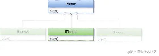 还要有华为手机和小米手机的类,分别叫做Huwei和Xiaomi,这两个手机类要遵循手机只能用来玩游戏这个规范,所以它们要实现Phone类,并完成play()方法