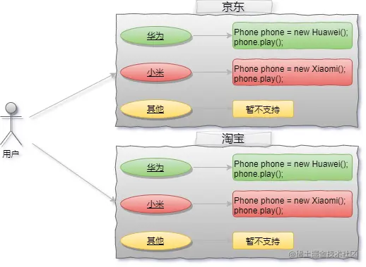 用户可以通过京东和淘宝来订购手机,所以还要有京东和淘宝的类,分别叫做Jingdong和Taobao。类里面各有一个订购方法叫做order(),可以根据用户的喜好来订购不同的手机