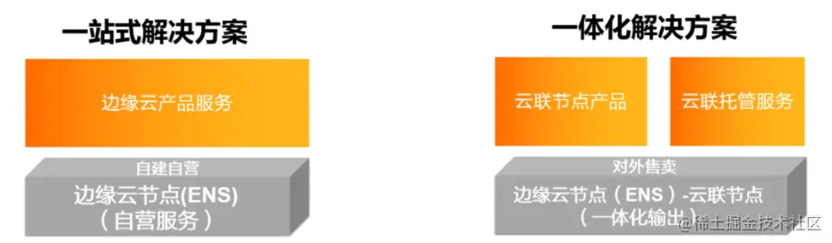 阿里云边缘云支持一站式的解决方案和一体化解决方案,一站式解决方案是在边缘云节点的底座上再沉淀出来现在已经比较通用的产品化能力。一体化解决方案就是云联节点概念,对外支持软硬件一体化售卖,客户可以建设自有边缘计算节点构建应用场景。