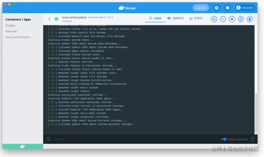 在前一小节的环境配置当中,我们启动了一个 Kind 集群,可以在 Docker GUI 里查看到相关容器信息: