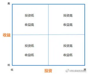 最后,是收敛的过程,我们需要在影响地图上寻找一条或者几条最快最短的路径,而不是全部路径都要走到。第四层的 What 是具体的行动层面,关键路径上的行动可能会很多,这时候就需要进行优先级排序,可以借助与投资收益矩阵工具去分析,最终留下的 what 就是将要进入到产品待办列表项的内容。