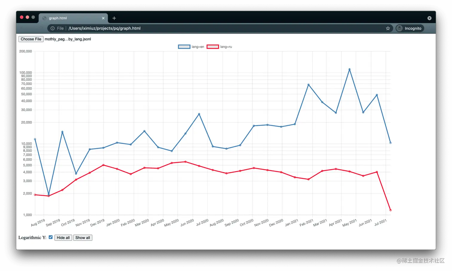 pq 是由 Rust 编写的日志解析工具,它可以将日志文件解析成类似于 PromQL 的时间序列,很有创意!例如: