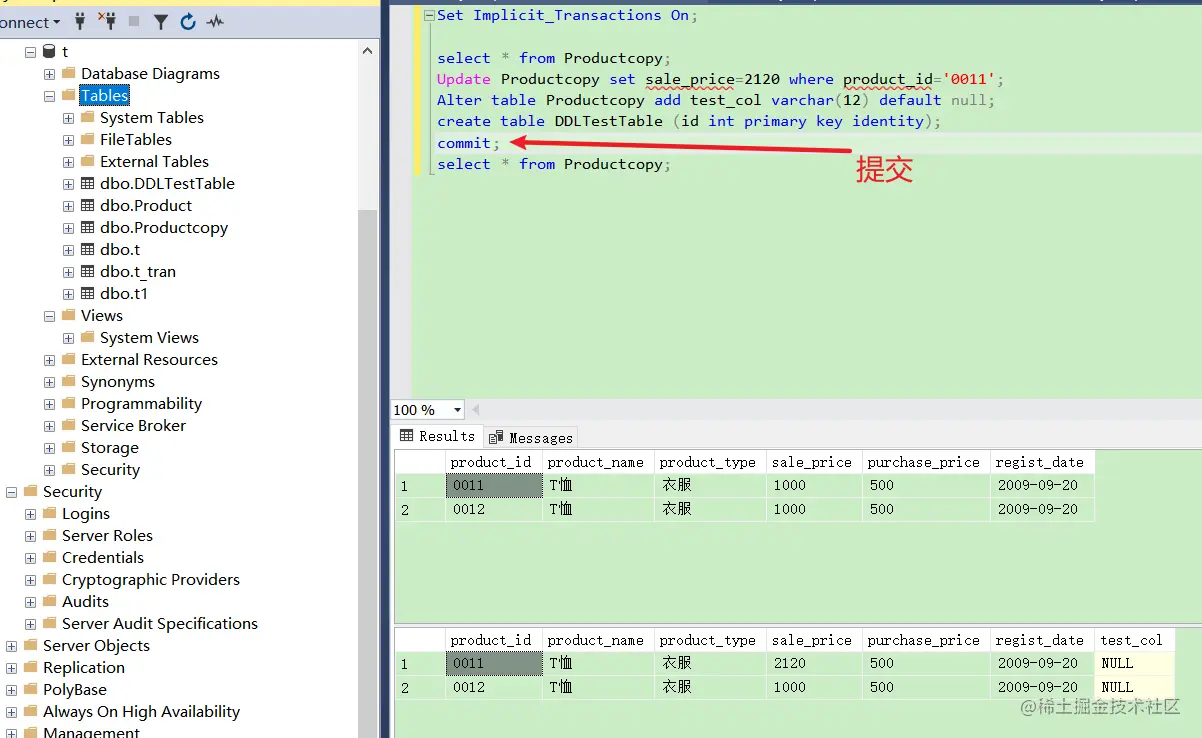 例如,实现如下事务,将运动T恤的销售单价降低1000,并将T恤衫的销售单价上浮1000,各个RDBMS中的事务使用如下: