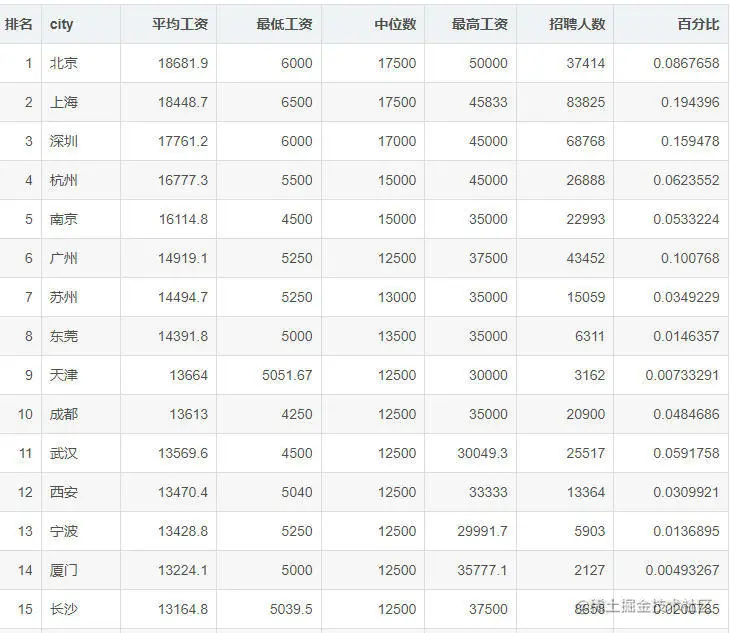 我们以城市为维度,来看一下各个城市程序员的工资情况。