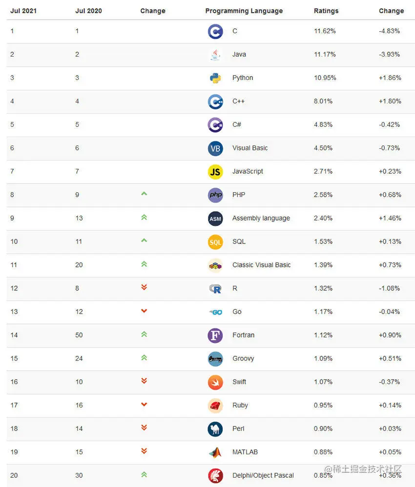 除了前三甲之间的激烈竞争,相比 6 月,本月 C++ 涨幅超过 0.5%,市场占比也在向前三名靠拢。除此之外,TOP 20 中还有一些值得关注的变化: