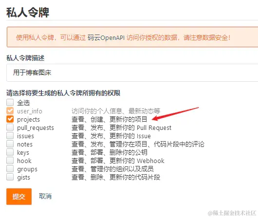 生成新令牌,把projects这一项勾上,其他的不用勾,然后提交这里需要验证一下密码,验证密码之后会出来一串数字,这一串数字就是你的token,将这串数字复制到刚才的配置里面去。