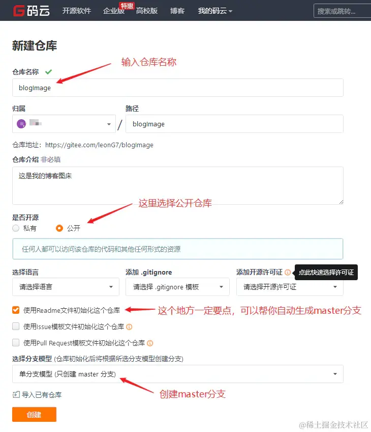 这个选项勾上,这样码云会自动给你的仓库建立master分支,这点很重要!!! 我因为这点折腾了很久,因为使用github做图床picgo好像会自动帮你生成master分支,而picgo里的gitee插件不会帮你自动生成分支。