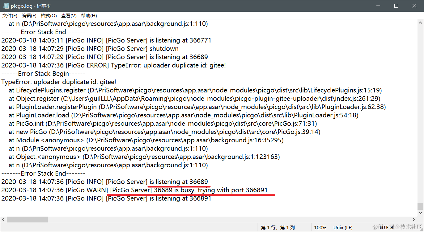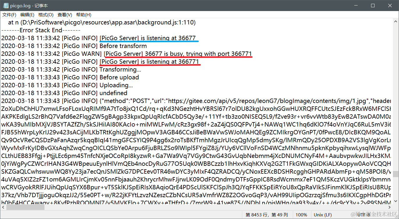 问题在于端口冲突,如果你打开了多个picgo程序,就会端口冲突,picgo自动帮你把36677端口改为366771端口,导致错误。log文件里也写得很清楚。