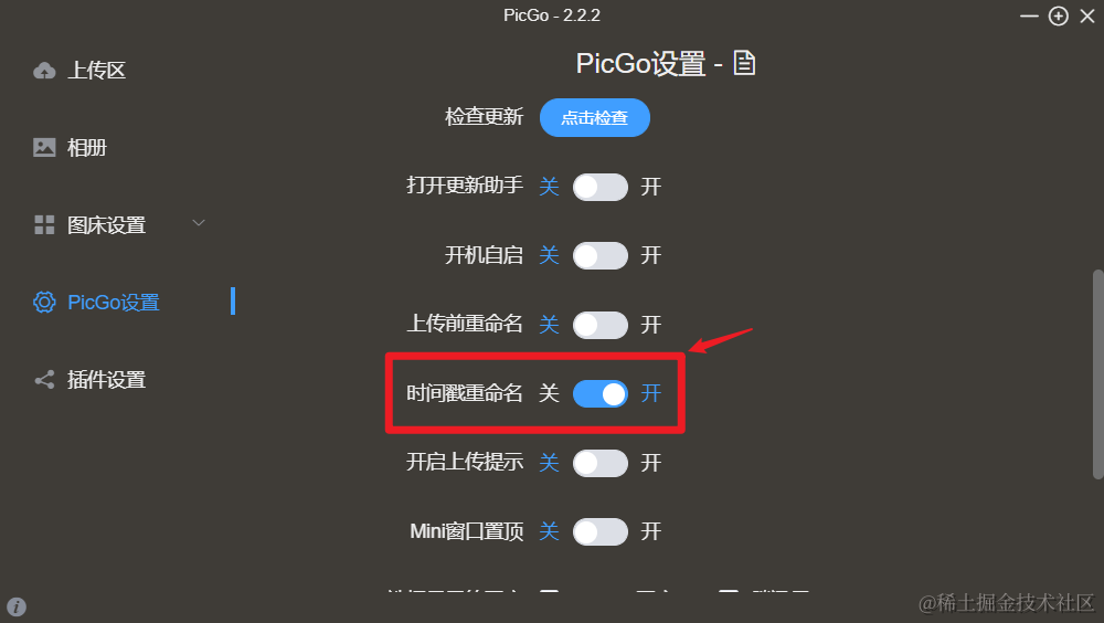 办法也很简单,打开picgo设置,将**【时间戳重命名】打开**。如图所示: