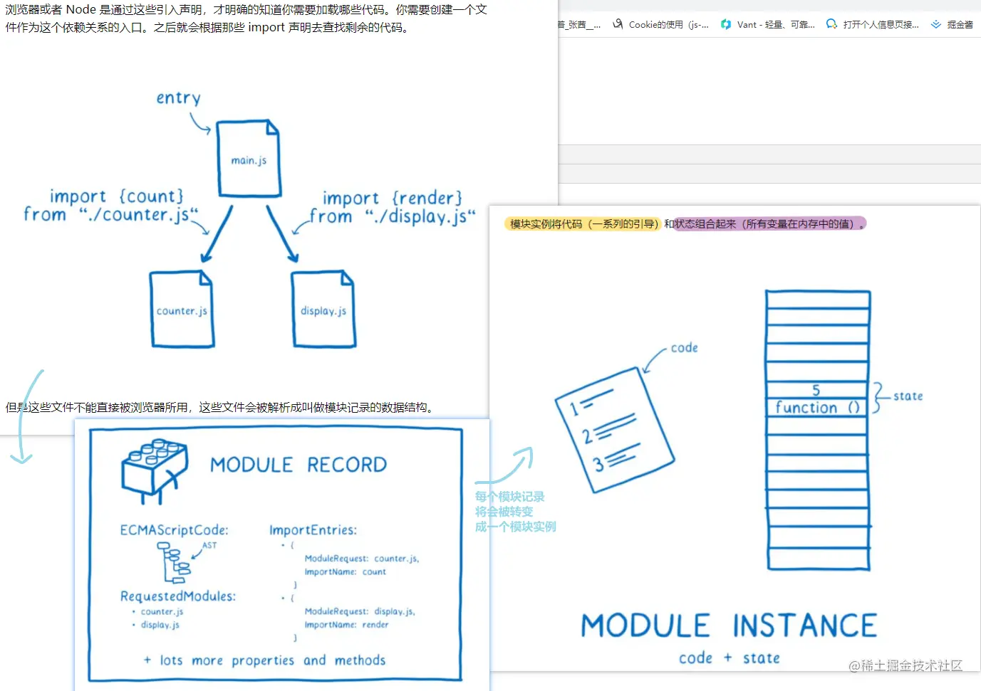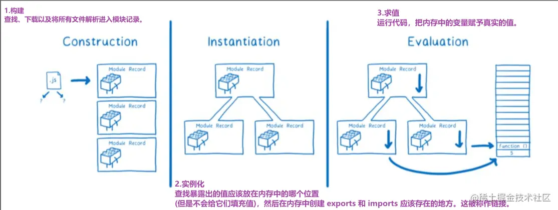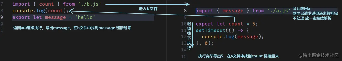 - 执行顺序:入口文件组织依赖图,依赖图上的每个节点存的是引用地址 ,循环引用的会打一个正在解析中的tag,解析完了通知我一下 我直接更新,执行好了后面的给他一个信号