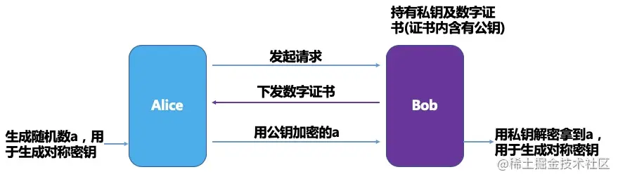 要把双证书讲清楚首先需要大家理解下 PKI 密钥协商机制,典型的密钥协商算法分为两种:RSA,ECDHE。国密的 ECC-SM2 密钥协商流程和 RSA 比较类似,算法核心的性质在于用公钥加密的数据可以用私钥解密,整个密钥协商流程简化如下图: