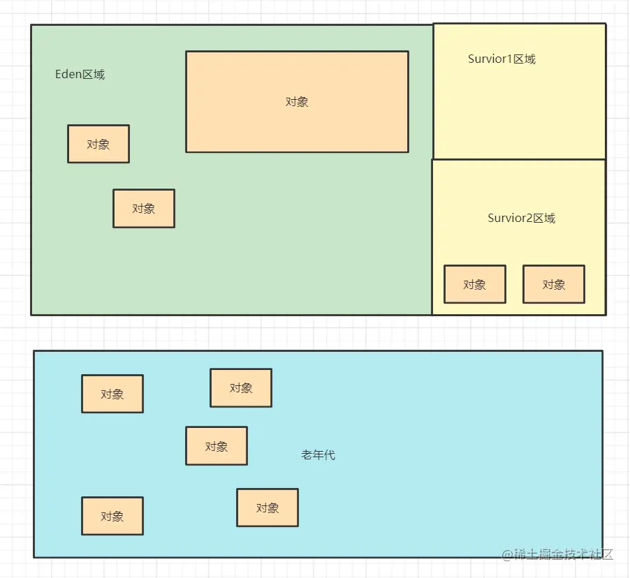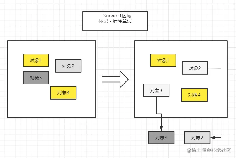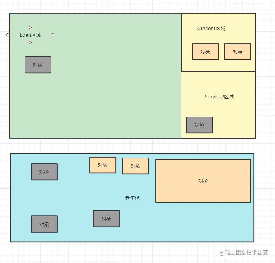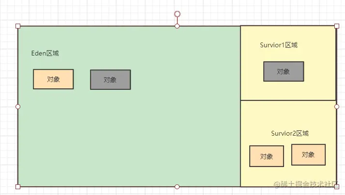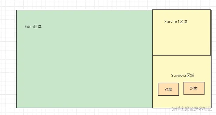 - 当eden区域对象满了之后,会把存活对象复制到survivor区域1,当下一次eden区域再次满了之后,就会把上一次survivor区域中存活对象以及eden区域的存活对象放到survior2区域当中,然后直接清空掉survior1的区域和eden区域的所有垃圾对象。