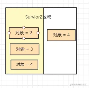 如果是minor GC,则进入下一次对象分配,当新生代又满了的时候,此时会把survior1的存活对象以及eden的存活对象拷贝到survior2区域: