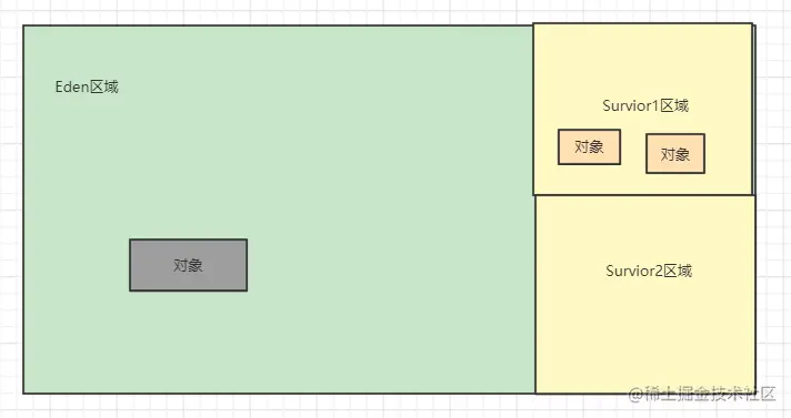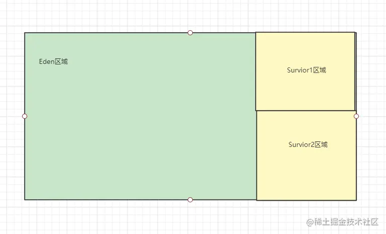 首先会根据 -XX:SurvivorRatio参数判定,对于新生代进行划分Eden区域,Survior1区域和Survior2区域,如下图所示: