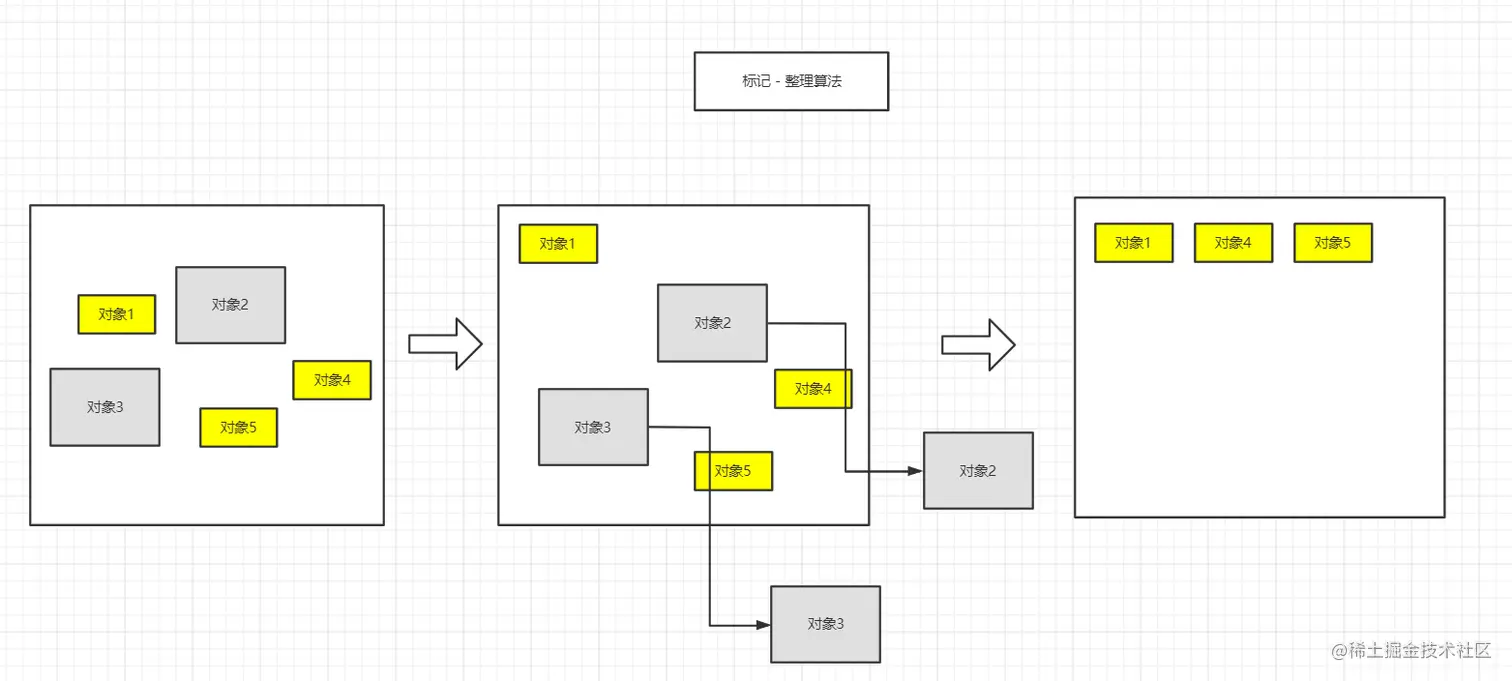 标记-整理算法是对标记-清除算法的一种改进,主要是在标记清除后加入了一步整理的操作。标记整理算法要比复制算法和标记清除算法要复杂不少,同时性能和效率也更低,通常作为老年代的算法使用。