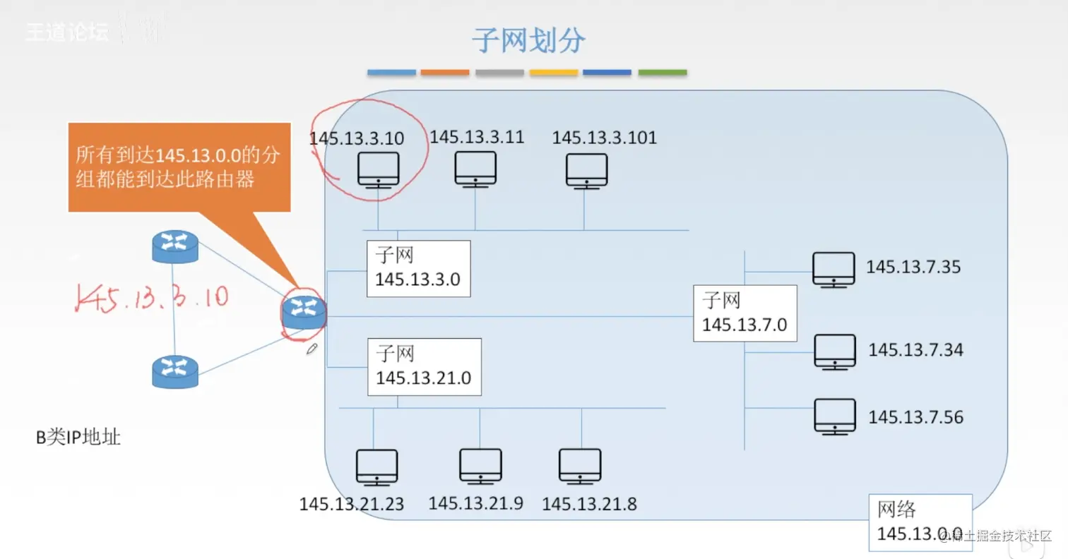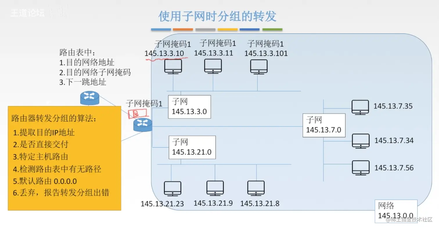 - 路由器的网段是145.13.0.0 ,属于此网段的数据报可以接入,在网络内部进一步进行划分,划分为145.13.3.0、145.13.21.0、145.13.7.0三个子网段