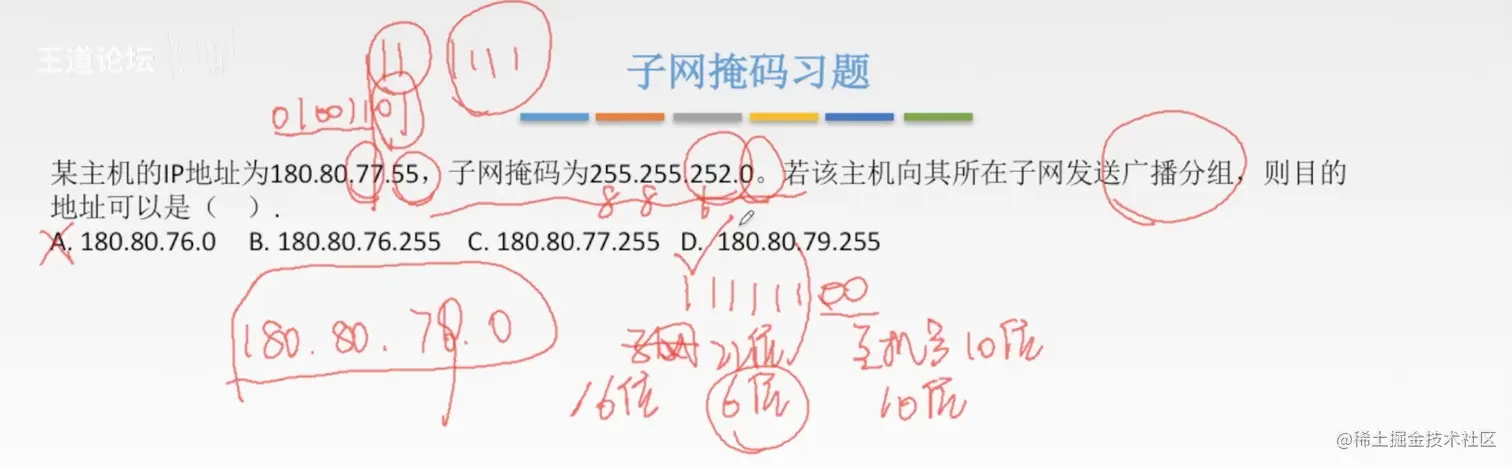 - 因此对于77 取前6位,表示为010011/01,所以主机所在的子网号是180.80.76.0,因为是广播地址,那么目的地址全是1,所以 11,11111111就是 79,255