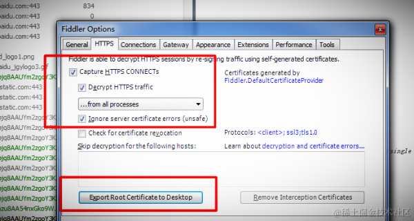 勾上后,Fiddler 会提示你安装一个证书。安装完后点击上图中的 "Export Root.." 按钮,将证书下载到桌面。