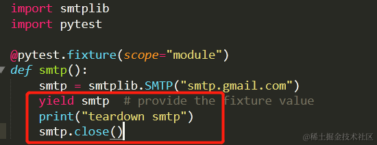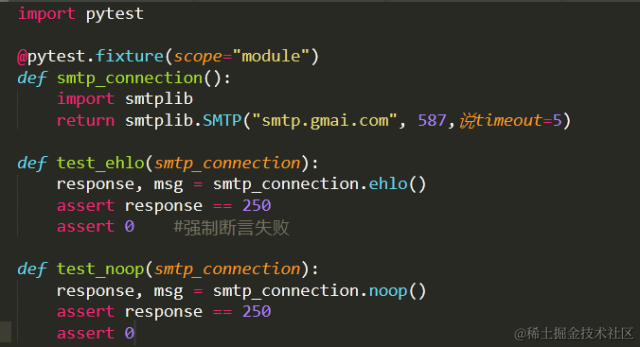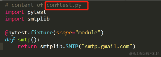 如上图, 这里的 test_ehlo函数,需要参数值smtp_connection,pytest就是找到并且调用这个用@pytest.fixture装饰的smtp_connection函数。
