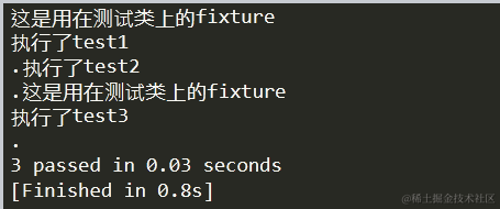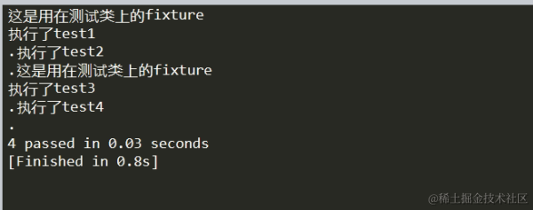 运行测试case,这个2个case文件下的所有case都会被找到,但是只会执行一次conftest.py中的 fixture。