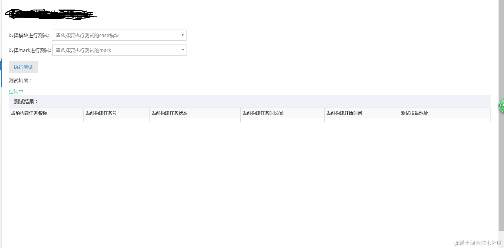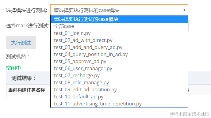 因为就一台机器,所以一个人在执行测试的时候,其他人再点击执行就不行啦,只要机器不是空闲的,就把执行测试的按钮置灰。 - 然后列表页展示相关信息,可以查看测试报告