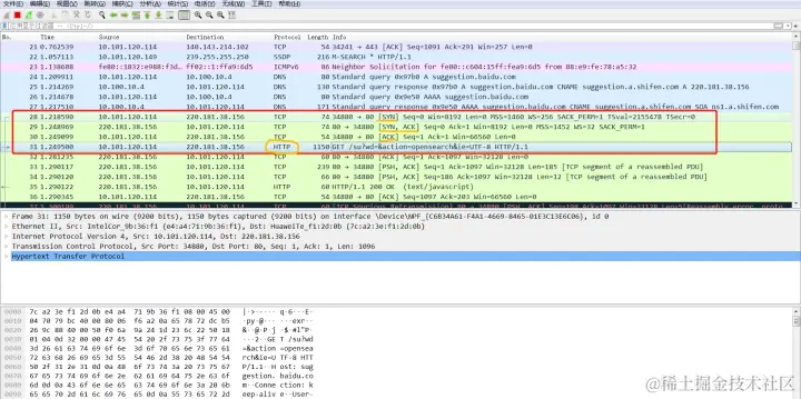 以这个http请求为例,可以看到,在http之前是有3次TCP连接的。在TCP连接中,从上到下依次是按照上方介绍的“握手”顺序,握手完成后,才进行http请求。