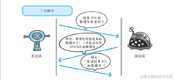 那如何能保证数据成功送达对方呢?“三次握手”就是保障通信可靠性的手段之一,顺序依次为: