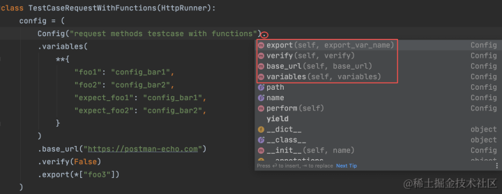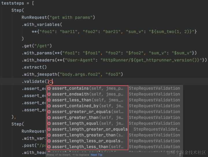 - 链调用:可以看到一个case的请求,经过了各个环节的调用,这也是httprunner 3.x版本一大亮点。现在的ide编辑器越来越强大,比如你使用pycharm的话,都不用你怎么记忆用例的格式,顺手就...(点)出来了,这或许也是官方推荐使用pytest的另一个原因吧,哈哈。