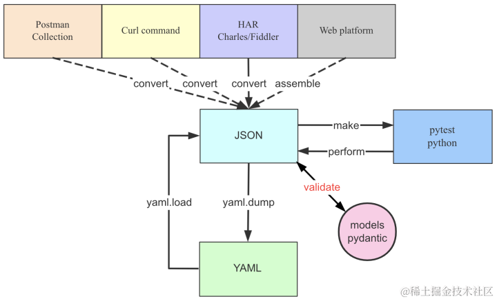 上图是来自官方的用例格式关系图,可以看出来,httprunner再对于第三方导出的har文件进行了转换处理,有的人喜欢转换成json,有的人喜欢转换成yaml。但是最终,还是通过解析json格式的文件,生成pytest的python文件。