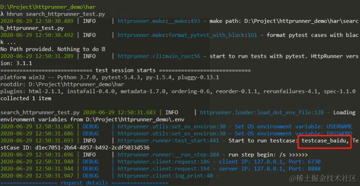 运行后,在debug日志里,可以看的用例名称被展示出来。