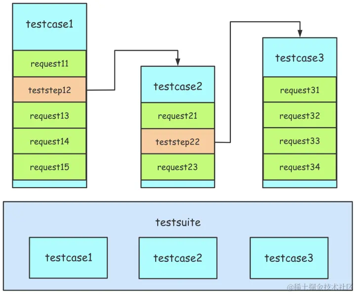 可以看到,testsuite包含了testcase,testcase1需要依赖testcase2才可以完成,那么就可以在teststep12对其进行引用;而testcase2又依赖于testcase3,那么也可以在teststep22进行引用。