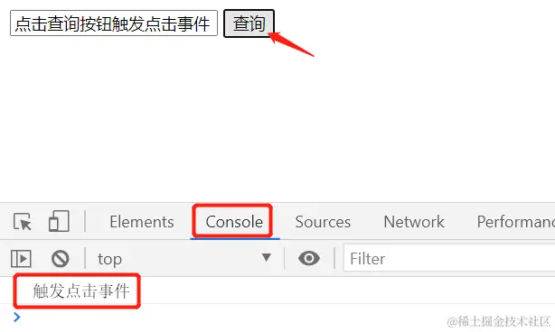 console.log('触发点击事件'),浏览器F12查看console,可以看到输出内容。