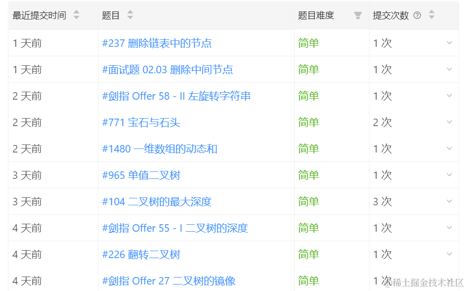 就这样,穿插着做了些简单的题目。毕竟还是个小白,得从easy模式开启,最主要的是培养好正确的解题思维,彻底消除对于LeetCode的