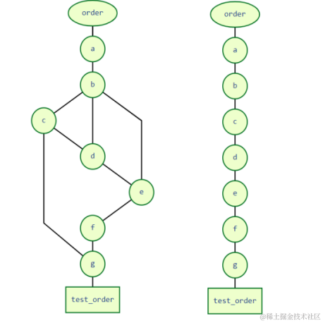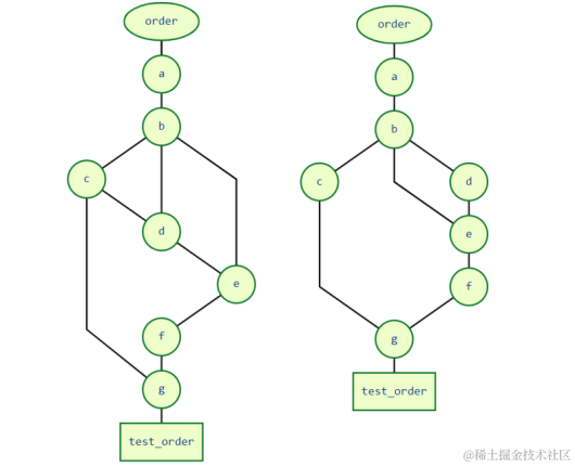 基于上述的请求依赖关系图(左),假设d没有请求c,那么此时的依赖关系就变成了右图所示: