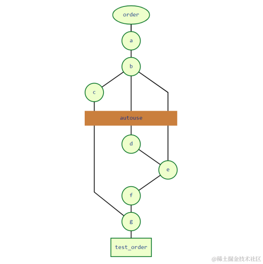 因为c变成了autouse,所以在图里处于d之上的位置,这时候pytest又可以将执行顺序线性化了。而且,c也让b和a都变成了autouse的fixture。