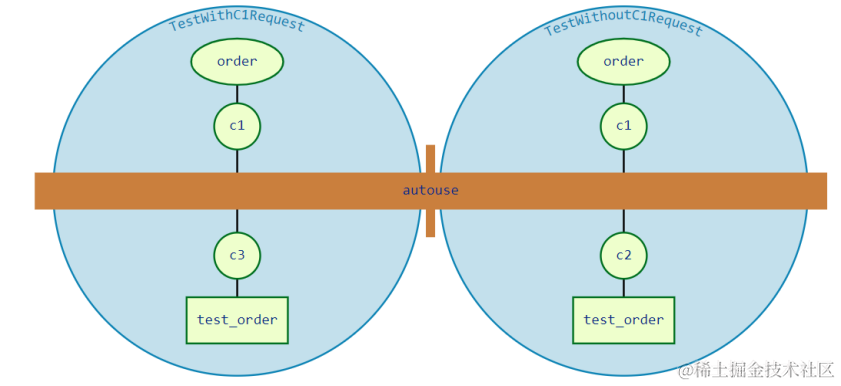 在这里,c3请求了还order,同样地,在c3的作用域内,order也扮演了autouse的存在。但是在TestClassWithoutAutouse,order就不是