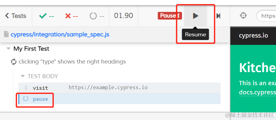 现在,在代码里加上一行cy.pause(),保存。