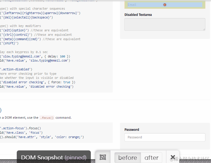 比如现在点击type命令,单击before将以输入框之前的样子,应该显示占位符文本信息。单击after将显示TYPE命令完成后输入的样子,