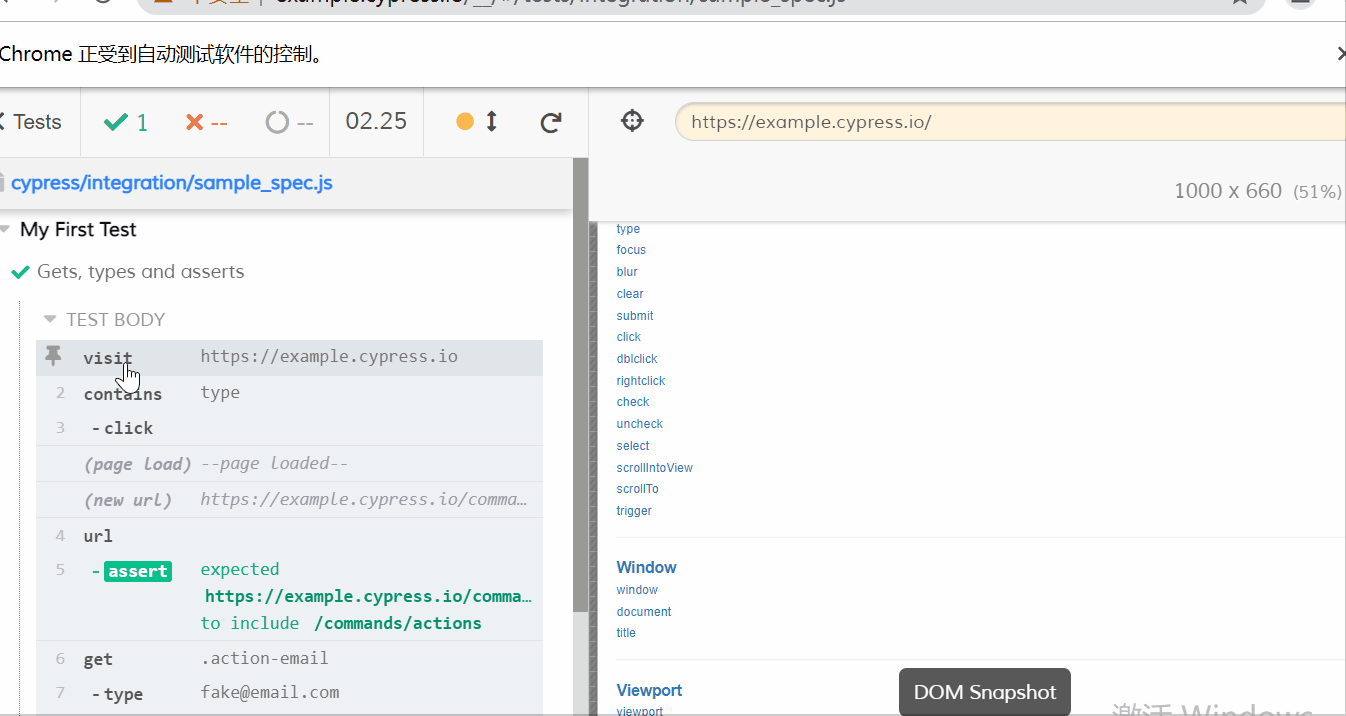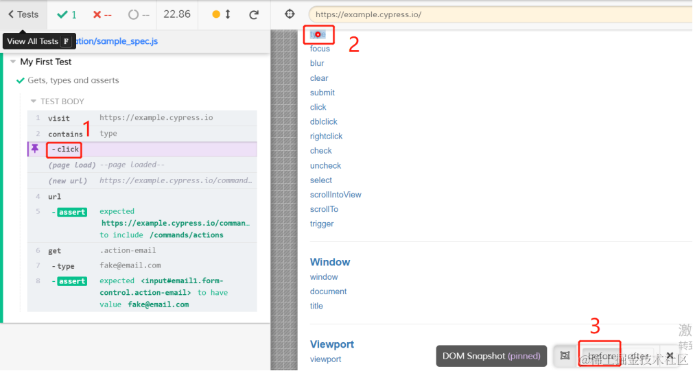 姑且叫它时间穿梭吧。期初我还有点莫名其妙,后来用了才知道,确实好用。就是当你的鼠标在左侧的命令日志上悬停时,cypress会自动回到那个命令解析时的快照,