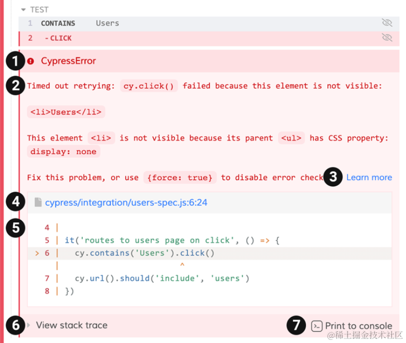 在cypress中,如果发生了错误,会打印如下的信息(对应图里标记的序号阅读):